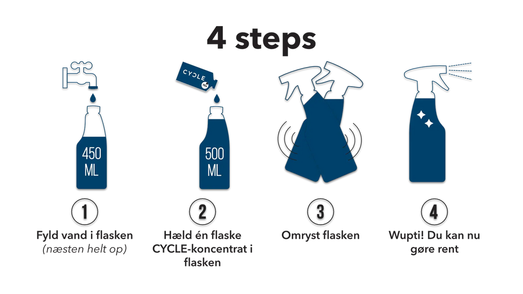 - Nem opblanding – fire enkle trin til effektiv rengøring: 1) Fyld en 500 ml sprayflaske med 450 ml vand. 2) Hæld hele 50 ml refill-koncentratet i flasken. 3) Omryst flasken grundigt. 4) Klar til brug! Sig nej til engangsplast!